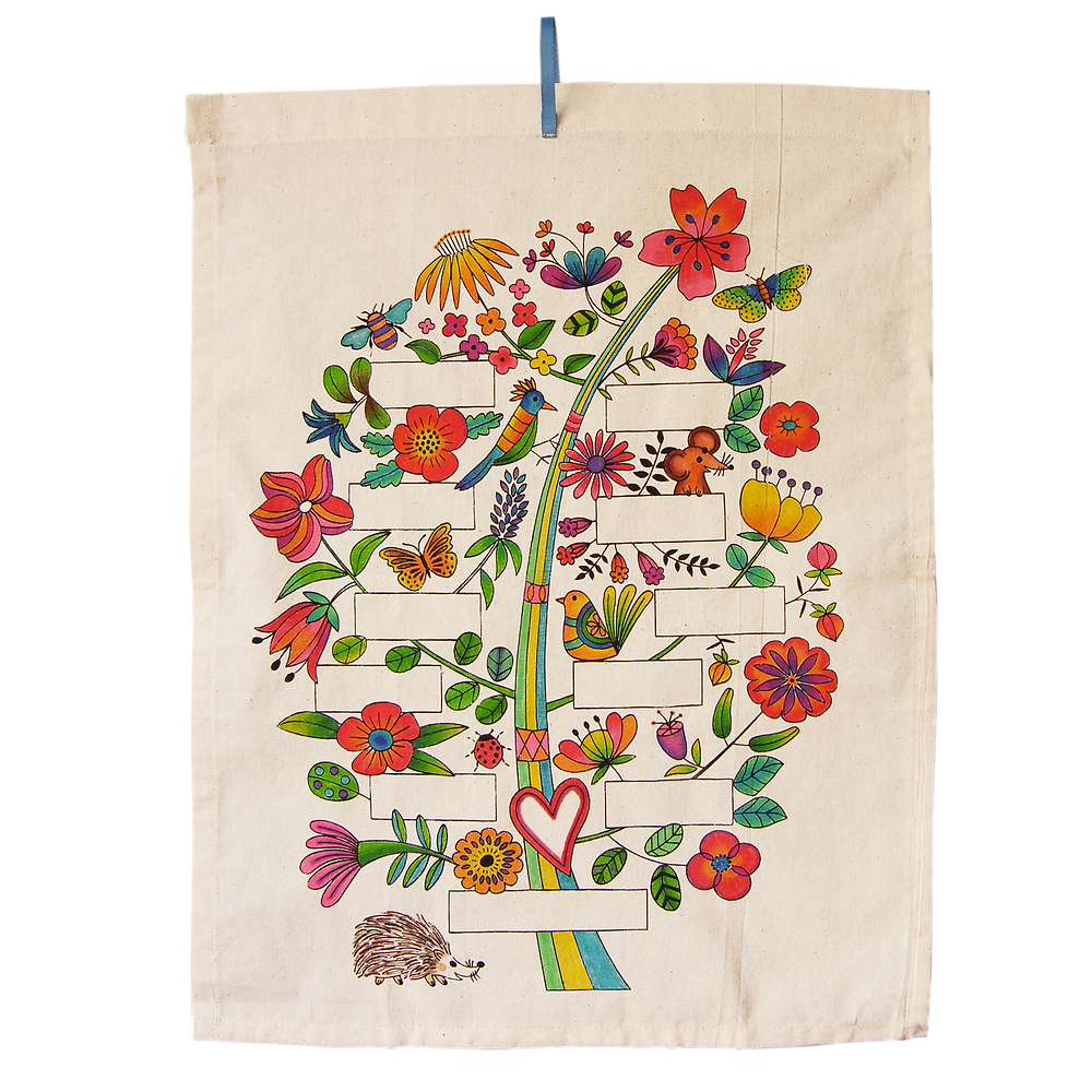 Tela crea impresa en serigrafía con diseño Árbol de Familia. Tiene bordes y una tirita para colgar. El borde superior permite pasar un palito de maqueta o similar, para dar rigidez al colgarlo.